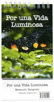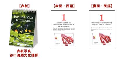 「日々の言葉」31日分を、表面にスペイン語、裏面には英訳文で美しい絵と共に掲載した卓上日めくり。平成21年5月から平成22年5月まで、谷口雅宣先生がツイッターに発表されたご文章と、よろこびの投稿SNSサイト「ポスティングジョイ」に掲載された絵や絵封筒で構成。紙製の本体を三角形に組み立てて使用する形態で、1日(1ページ)1点ずつ言葉と絵を紹介し、反対側には同日の言葉の英訳文と同じ絵を掲載。年月や曜日の記載が無いため、いつからでも何年でも使用できて便利です。